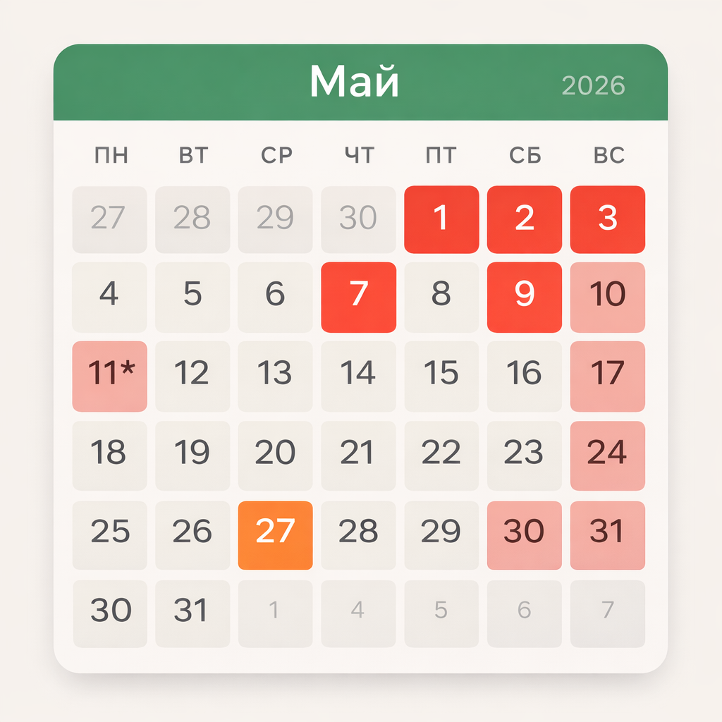Следующий период отдыха связан с государственными праздниками и переносами. День защитника Отечества, который отмечается 7 мая (четверг), формирует отдельный выходной. При этом День Победы, выпадающий на субботу, переносится на понедельник — 11 мая. В итоге образуется длинный уикенд с 9 по 11 мая.