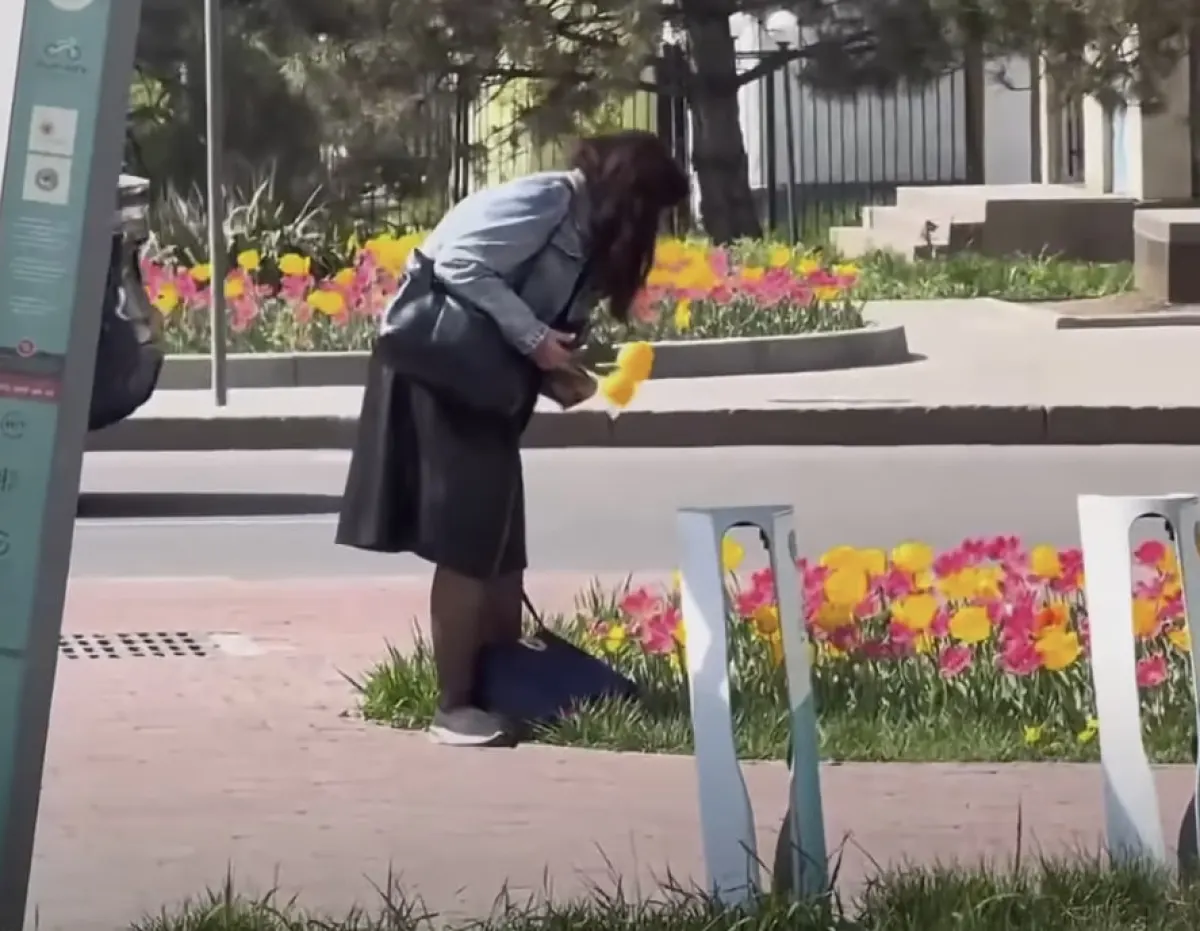 Жители Алматы возмутились женщиной, сорвавшей тюльпаны на Аль-Фараби