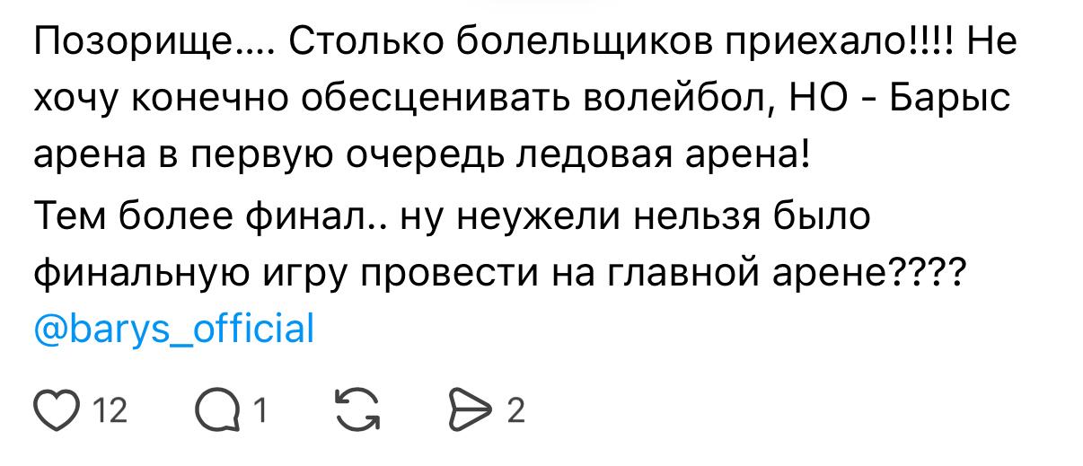Пользователи также отмечают, что встреча проходила в небольшом зале, тогда как в соседнем в это же время проводился баскетбольный матч. В своих публикациях они обвиняют «Барыс Арену» в плохой организации мероприятия.
