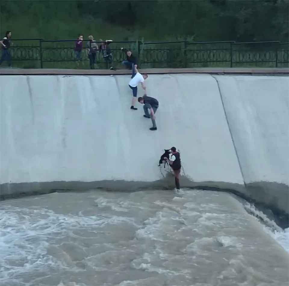 На помощь пришли прохожие. Люди, которые не были знакомы друг с другом, не прошли мимо: они выстроились в живую цепочку, держась за руки и помогли выбраться сначала собаке, а затем и мужчине. Этот момент сняли на видео.