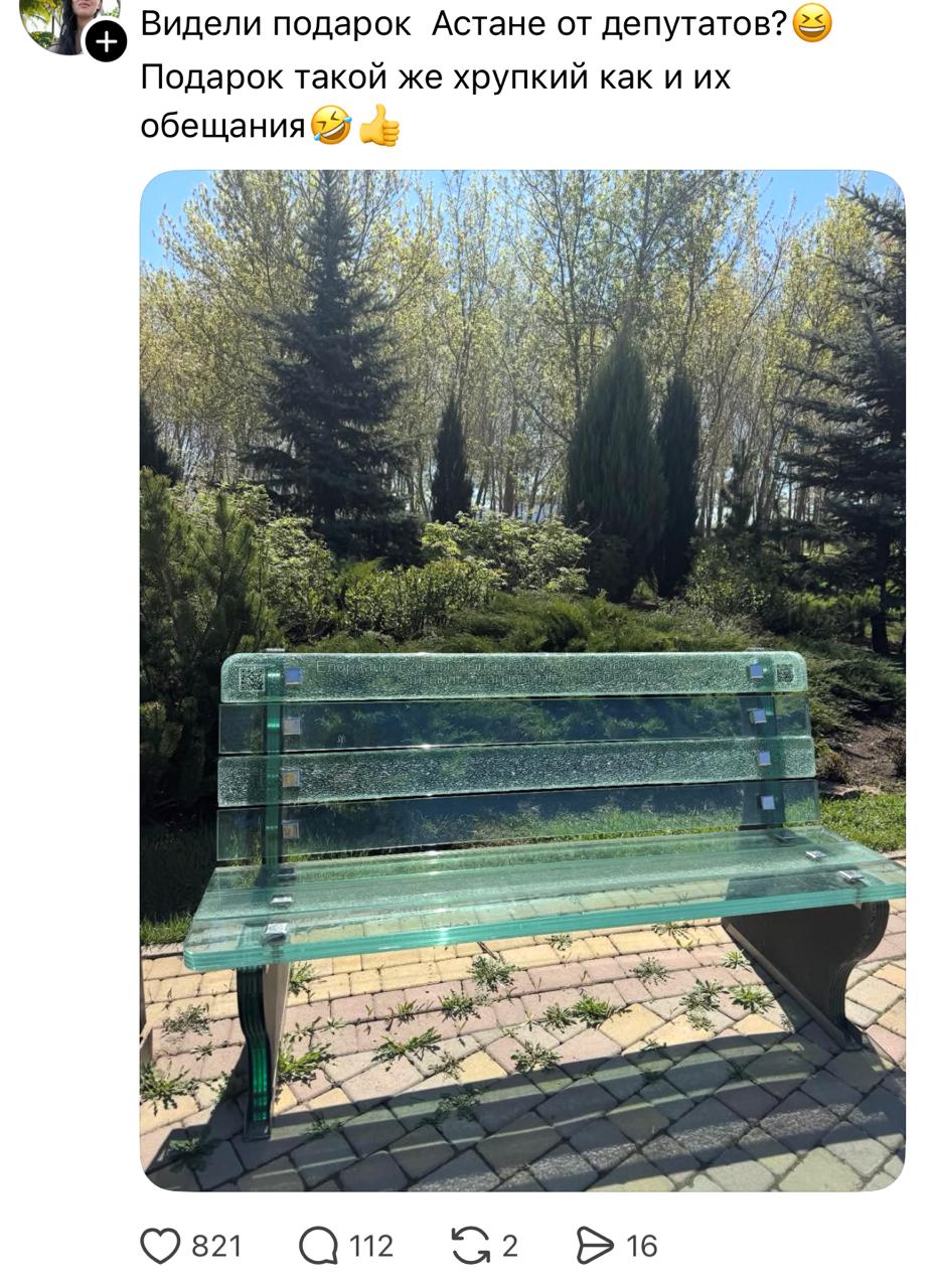 Поводом для обсуждения стала публикация местной жительницы по имени Айгерим. В своей ветке она высмеяла подарок депутатов, сравнив хрупкость стеклянной скамейки с непрочностью обещаний чиновников.