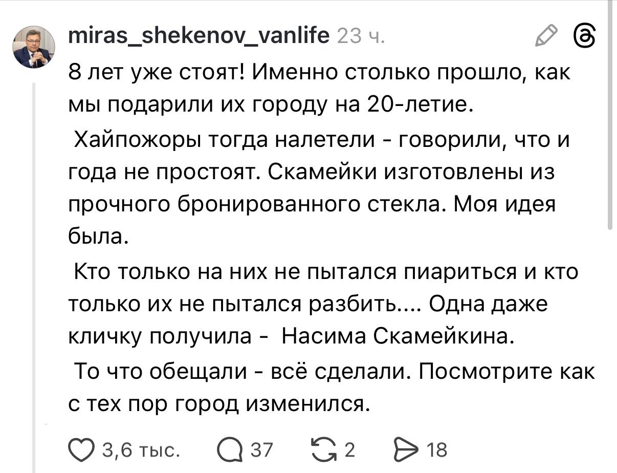 Позже в ситуацию вмешался экс-депутат маслихата и общественный деятель Мирас Шекенов, который, по его словам, был инициатором идеи этого необычного подарка. Он также отметил, что скамейка установлена в городе уже около восьми лет.