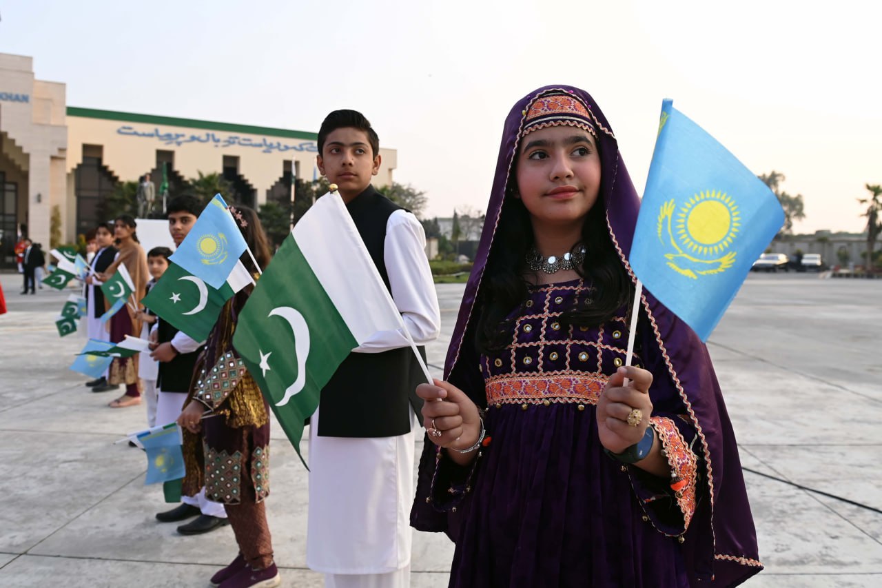 Касым-Жомарта Токаева также приветствовала группа детей с флагами Казахстана и Пакистана.