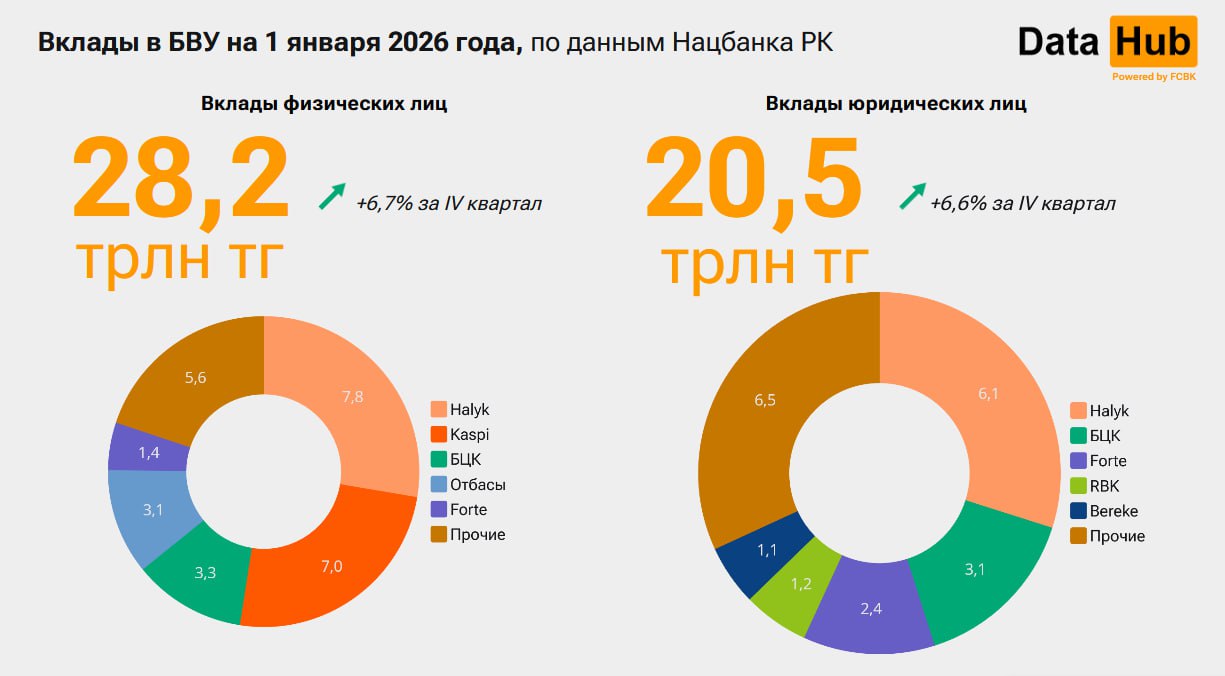 Активы банковского сектора выросли до 70,8 трлн тенге (+5,6% за квартал). Ссудный портфель рос медленнее – 4,4%, до 43,5 трлн тенге. Вклады населения и бизнеса увеличились почти одинаковыми темпами – около 7%. На 1 января депозиты физлиц достигли 28,2 трлн тенге, бизнеса – 20,5 трлн.