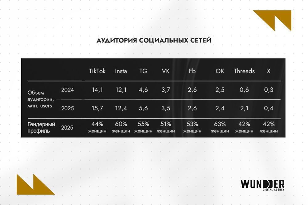 Социальные платформы в Казахстане вошли в фазу зрелости. TikTok сохраняет лидерство по охвату и вовлечённости, однако потенциал органического роста близок к исчерпанию. Instagram остаётся стабильной площадкой с высоким уровнем доверия аудитории, особенно в сегментах lifestyle и FMCG.