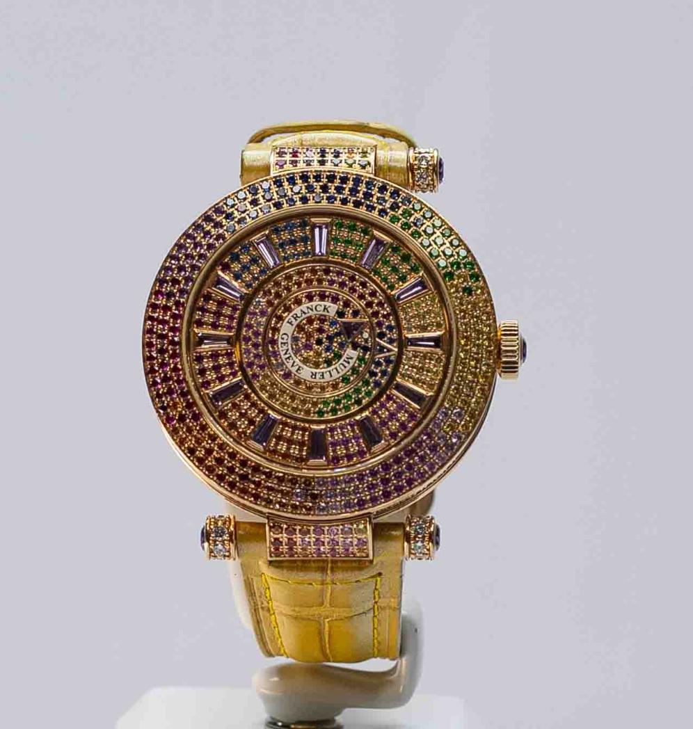 Наручные часы Frank Muller Geneve с сапфировым стеклом — 24,880 миллиона тенге. Циферблат инкрустирован рубинами, сапфирами и цаворитами, стрелки — рубиновые. Имеются царапины на корпусе, ремешок повреждён. На летнем аукционе их оценивали в 20 миллионов, в этот раз цену решили сильно не поднимать.