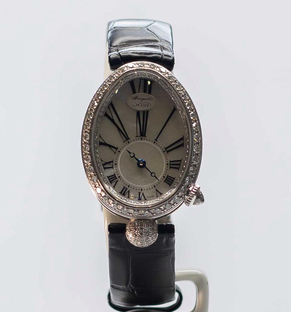 «Корпус из 18-каратного белого золота овальной формы с рифлёными элементами. Безель, фланец циферблата и ушки украшены 139 бриллиантами классической огранки (около 1,255 карата). Заводная головка украшена бриолетовым бриллиантом (около 0,26 карата). Задняя крышка выполнена из сапфирового стекла. Имеются царапины на корпусе, ремешок повреждён».