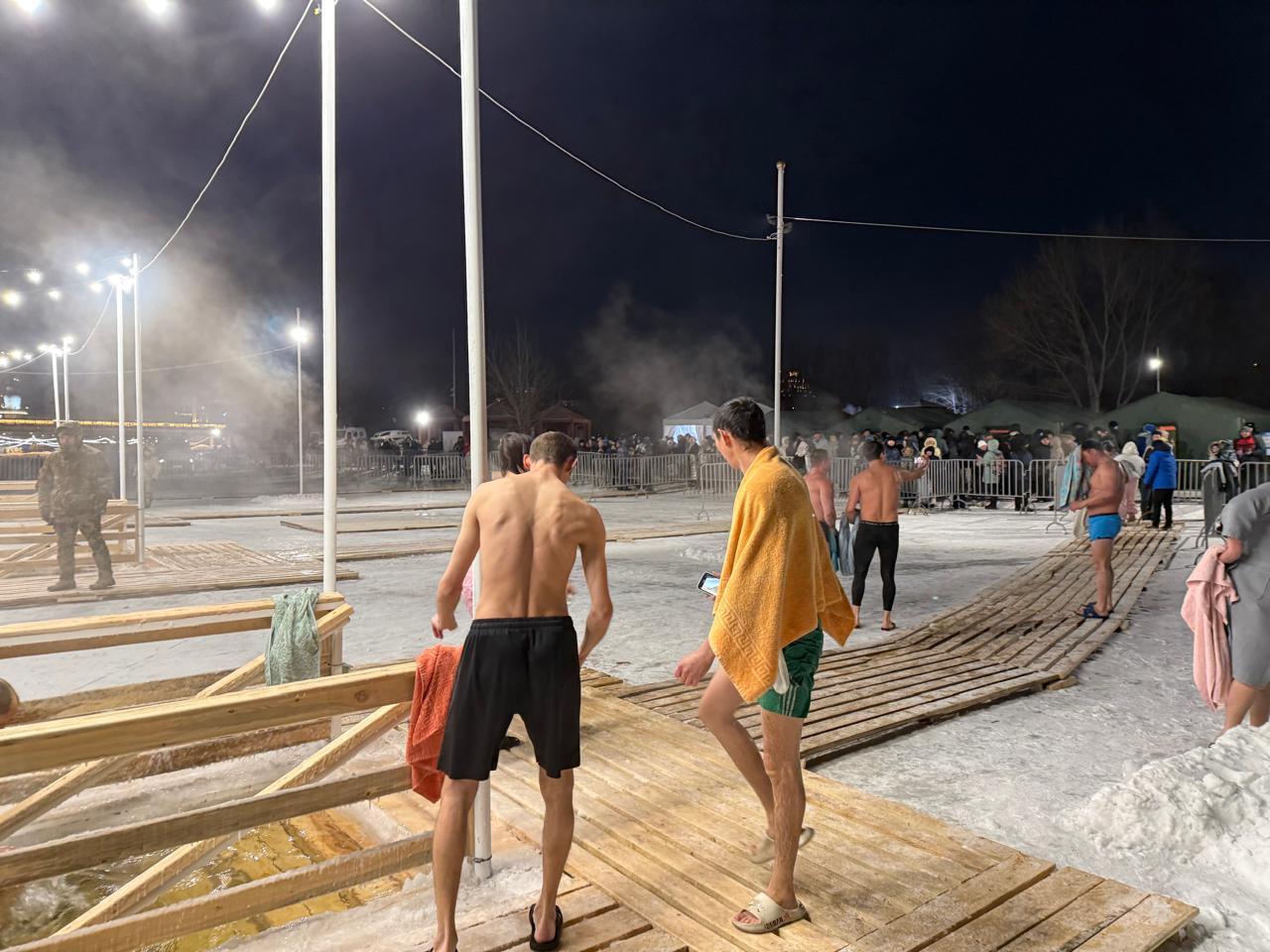 На реке были оборудованы три купели с деревянным настилом. Рядом с каждой из них в целях безопасности дежурили по несколько спасателей. Территория купаний была огорожена: за ограждениями терпеливо ждали своих родственников, знакомых и друзей так называемые группы поддержки, а также прохожие, которые специально останавливались, чтобы посмотреть на тех, кто решился окунуться в ледяную воду в морозную погоду.