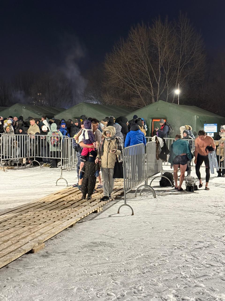 К слову, на территории массовых купаний были созданы все условия. Для людей были установлены специально оборудованные палатки для переодевания, где можно было согреться и сразу одеться после погружения в прорубь. Правда, из-за большого наплыва желающих там образовались очереди, а палатки оказались переполнены.