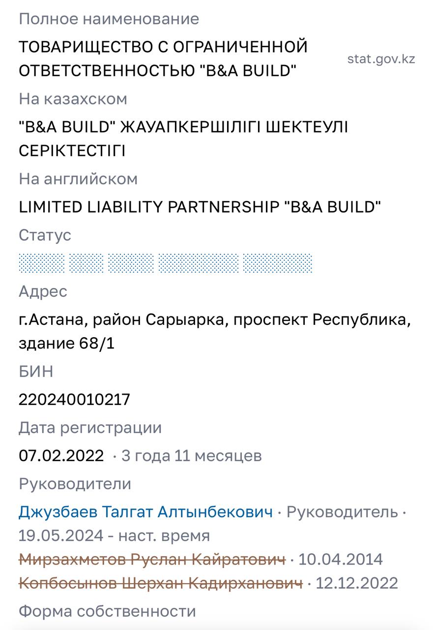 О ТОО «B&A Build» в открытых источниках представлено немного информации. Согласно доступным данным, это небольшая казахстанская строительная компания, зарегистрированная в Астане в 2022 году и специализирующаяся на строительстве жилых зданий. За время существования предприятия в нём уже сменились два руководителя, однако сведений о них в открытых источниках практически нет.