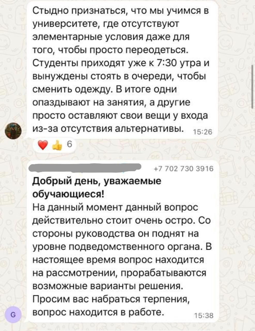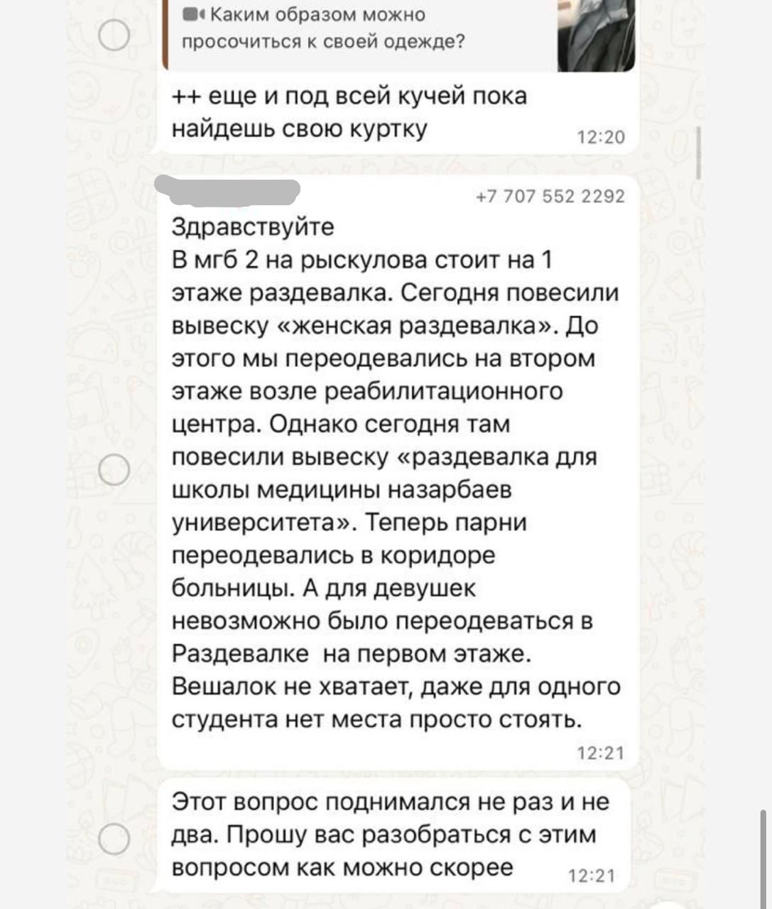 В результате студентам приходится переодеваться в коридорах и общих гардеробах. Бывают случаи пропажи личных вещей. Как следует из скриншотов учебных чатов, предоставленных редакции, оставленную в коридорах одежду иногда просто выбрасывают уборщицы.