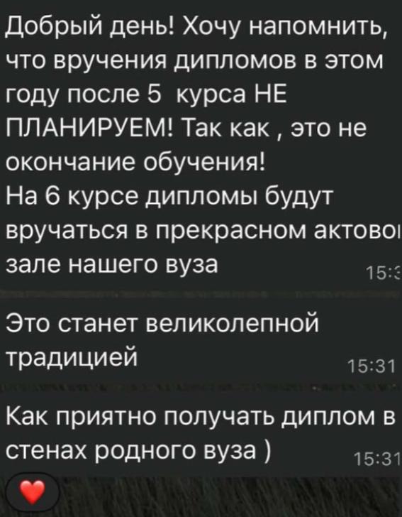 Аналогичная ситуация, по словам студентов, и с вручением дипломов. В этом году пятикурсникам предложили забрать дипломы в деканате. Раньше вручение дипломов проходило в «Астана Опере», но в этом году, сказали, что денег на это нет. В итоге студенты заявили о намерении подать петицию с требованием пересмотреть это решение. На момент публикации материала результаты инициативы известны не были.