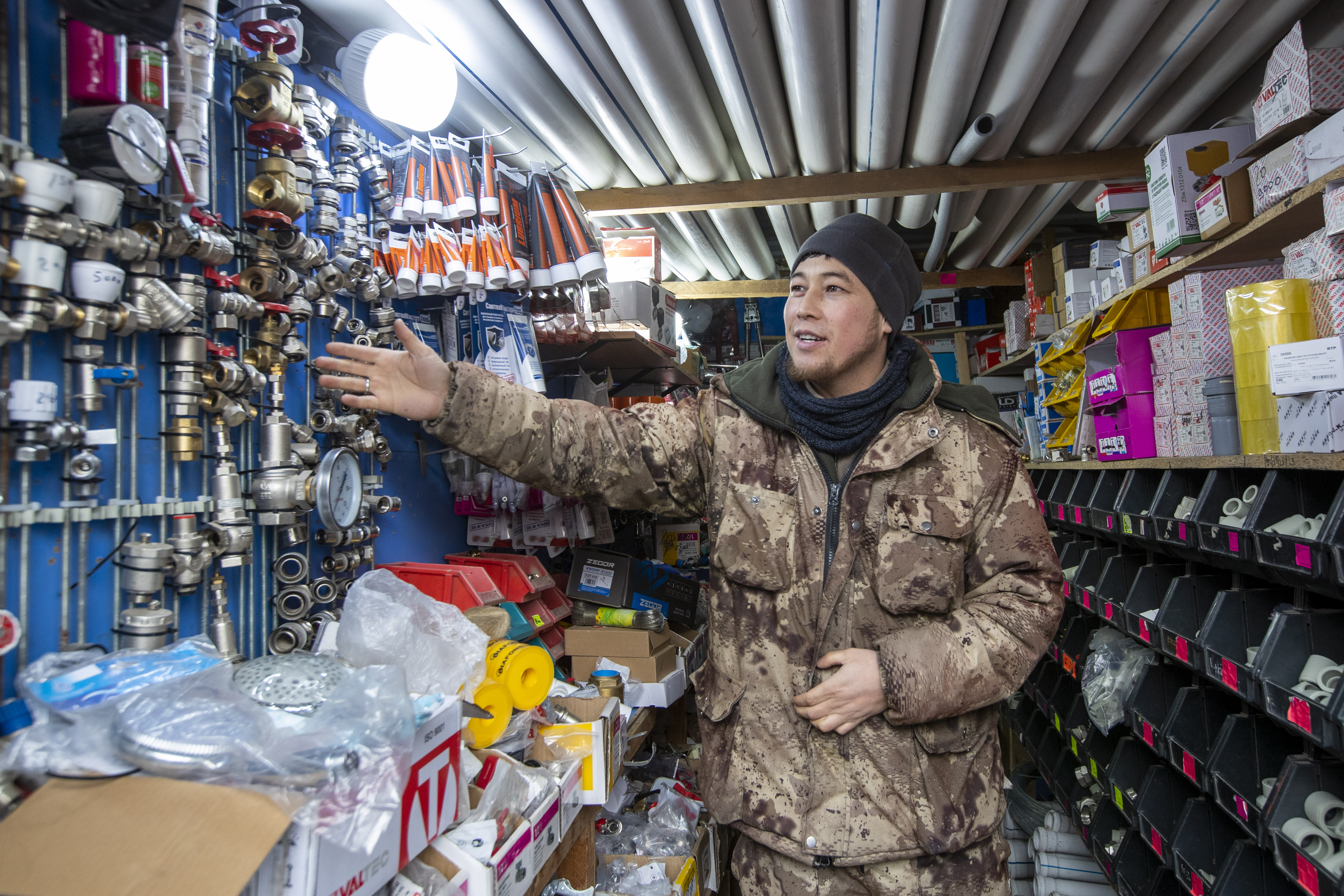 «Это адаптер, а здесь — муфты и переходники. Формально они похожи, но это продукция разных производителей. Вот, например, фирма Valtec. Это российский бренд, но изделия выпускаются в Китае по лицензии. На сегодня это один из наиболее качественных и при этом доступных материалов в сантехнических работах. Я получаю их с двадцатипроцентной скидкой, потому что работаю с поставщиком по договору и на определённых условиях. Для меня это очень выгодно. У других продавцов на рынке этот же товар тоже есть, но уже по более высокой цене», — рассказывает Аяз.