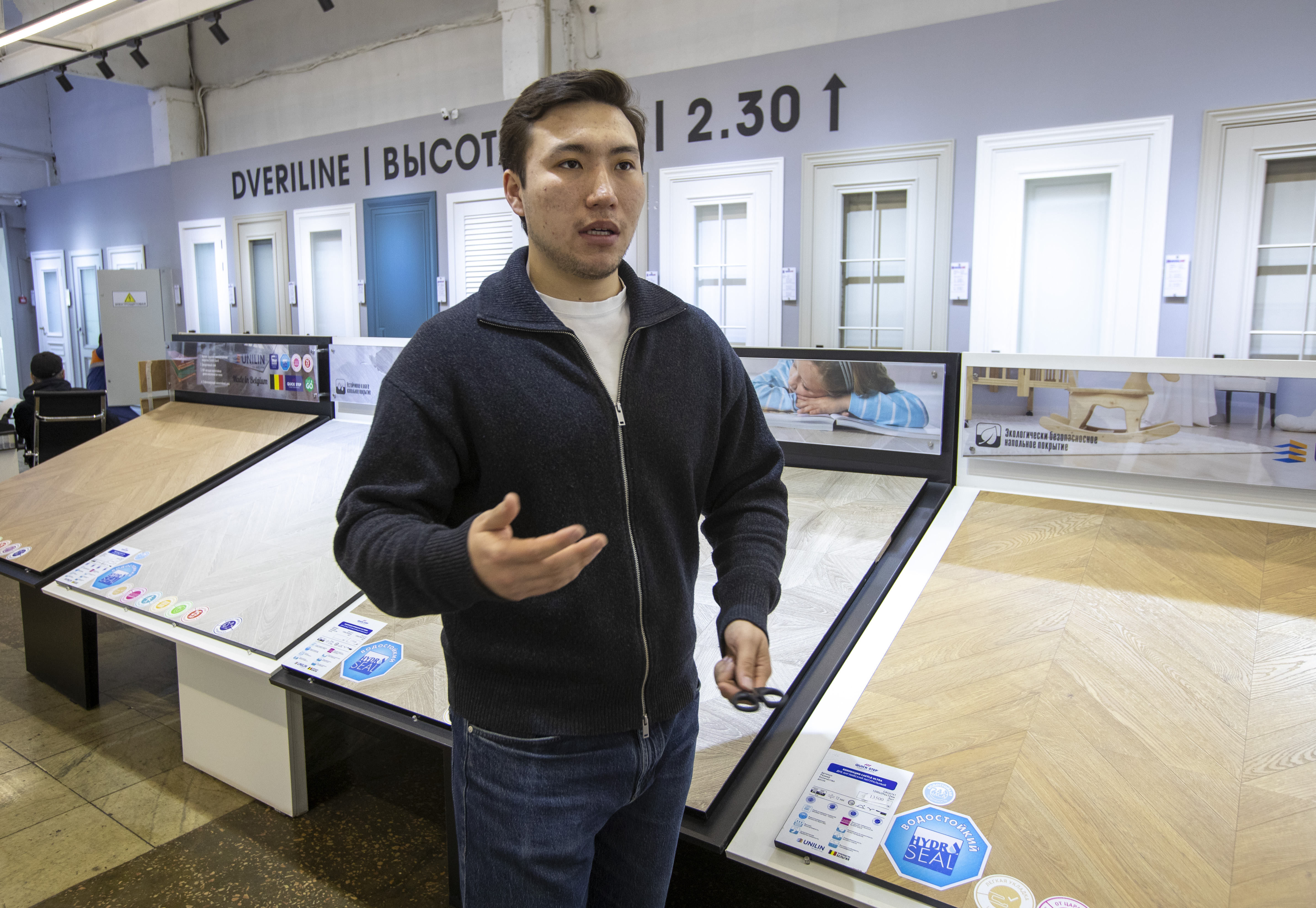 «Водостойкость — очень важная характеристика. Китайский ламинат, как правило, разбухает. Кроме того, у нас есть антивандальный ламинат. Его сложно поцарапать — например, при передвижении мебели. На обычных покрытиях могут оставаться трещины или царапины, а здесь этого не происходит», — говорит Ануар и предлагает нам выбрать любое напольное покрытие.