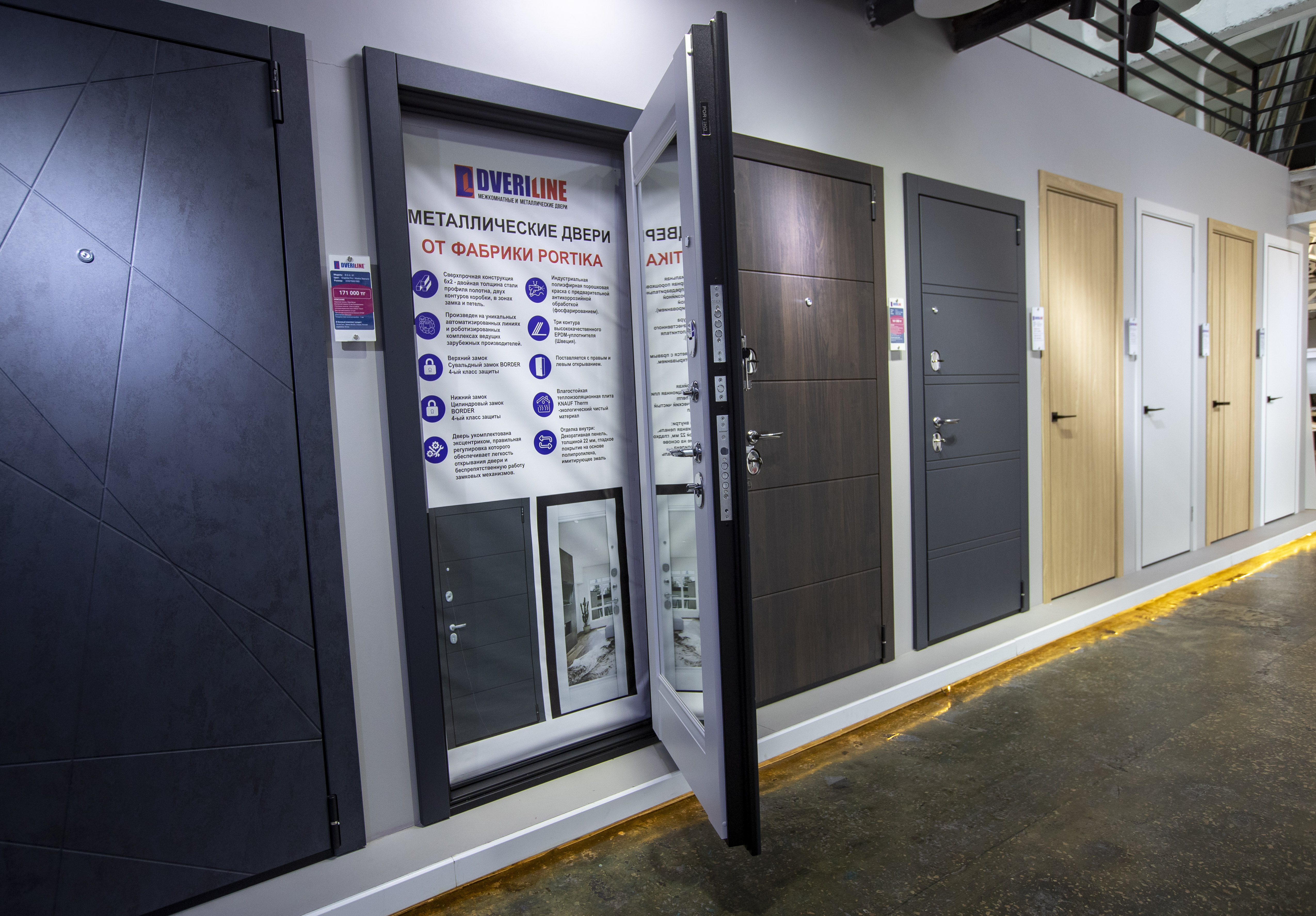 Пройдя ещё немного, мы решаем заглянуть в магазин, расположенный рядом с рынком. Здесь продают межкомнатные и входные двери, ламинат, плинтусы и фурнитуру. Управляющий Ануар работает в этом магазине уже шесть лет и, как выясняется, хорошо разбирается во всех сегментах продукции. Оказывается, это один из двух крупных шоурумов в Казахстане, где под заказ изготавливают двери практически любой сложности и высоты.