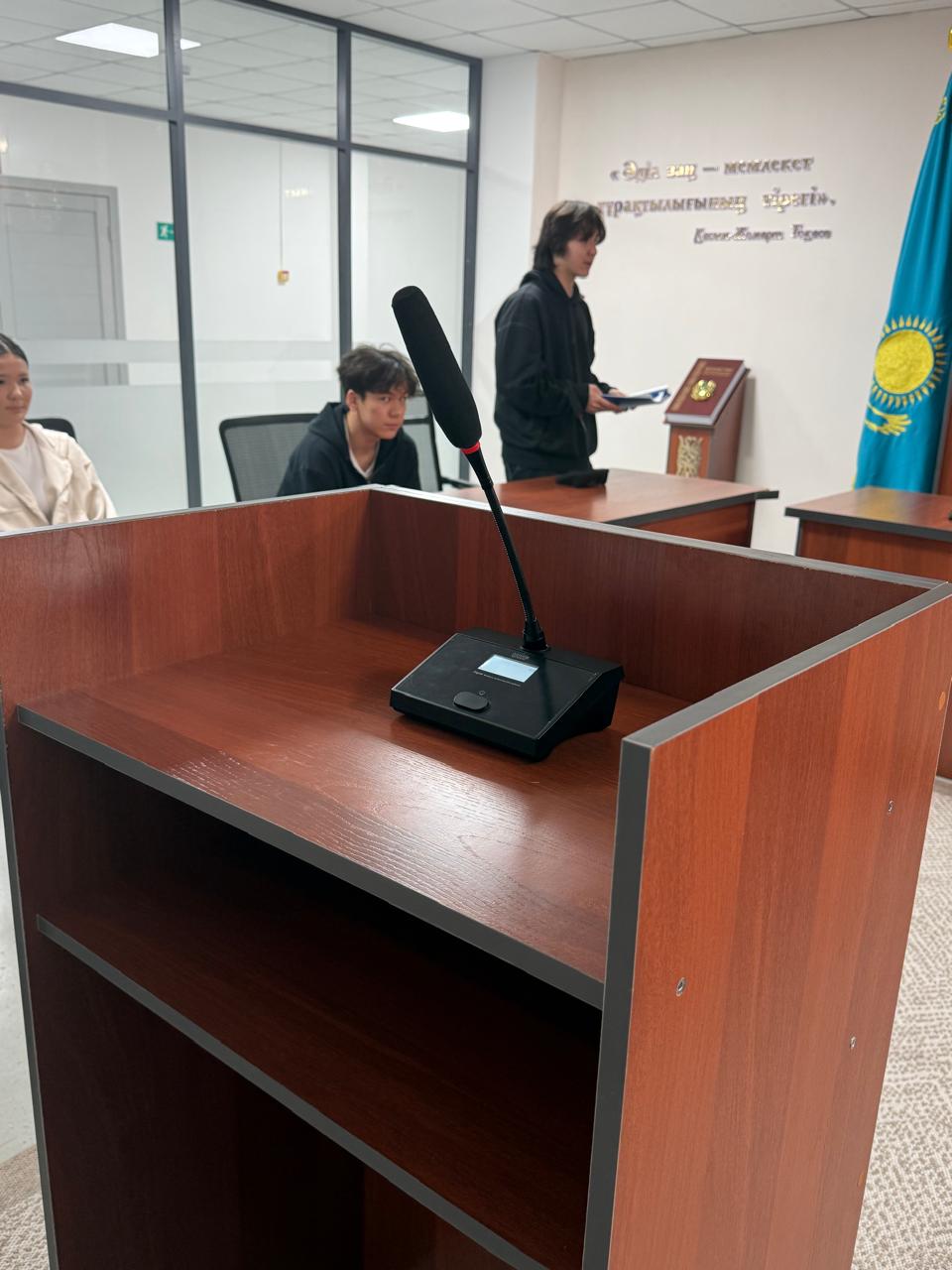 Для имитированного зала суда в школе выделили отдельный кабинет. Внутри установлен макет Конституции Республики Казахстан, размещены государственные символы и плазменный телевизор, на котором показывают материалы дела. Также оборудованы трибуны для судьи, свидетелей и других участников процесса.