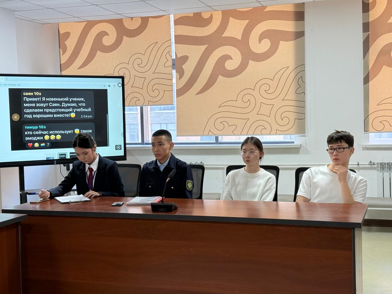На этот раз в роли участников процесса выступили ученики 10 «З» класса. Темой стал кибербуллинг. По сценарию, в сентябре в класс пришёл новенький – Саян. Он решил познакомиться и первым написал в общий чат. Но вместо поддержки получил насмешки: сначала от Тимура, а затем к травле подключился почти весь класс.