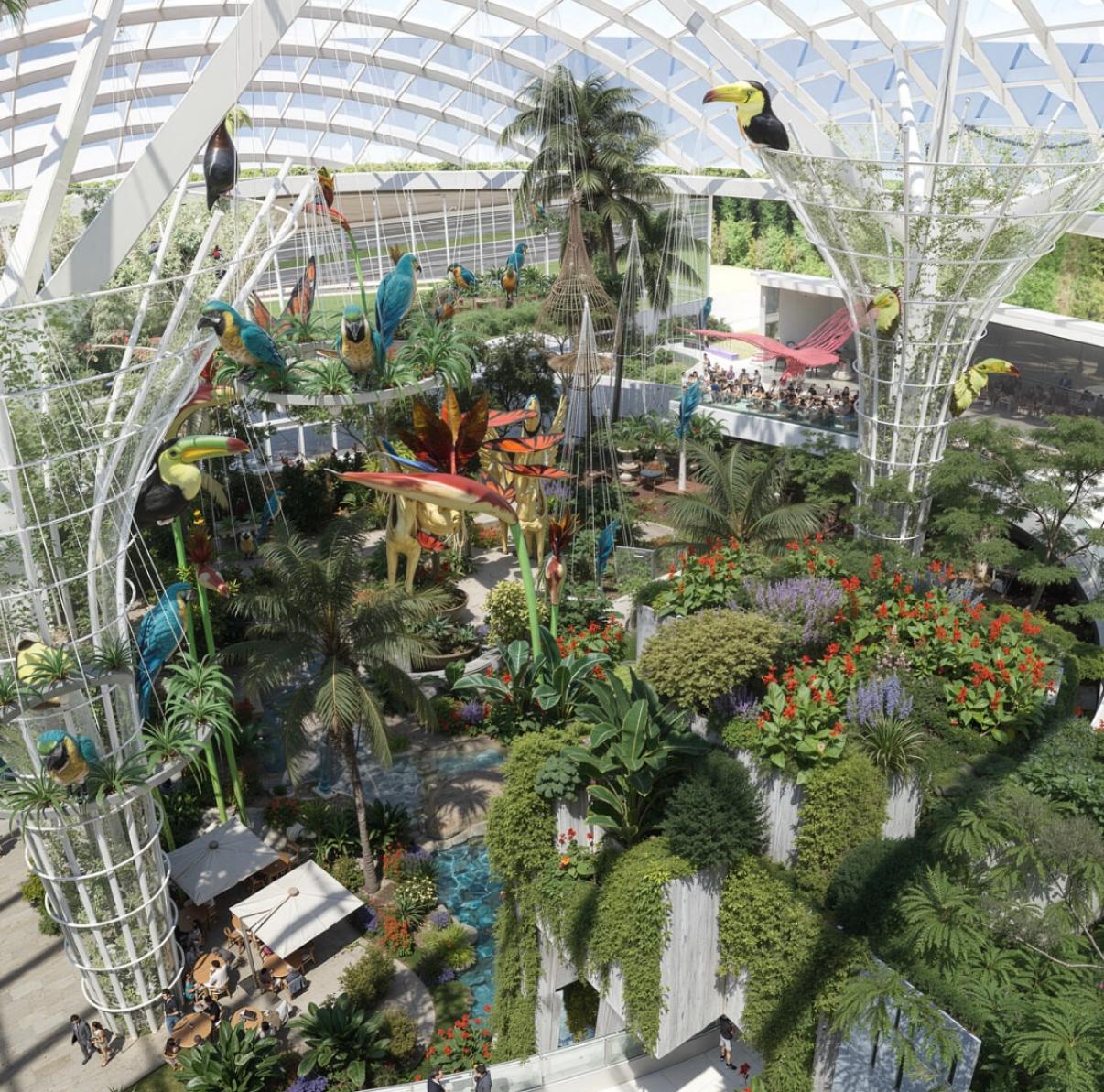 Речь идет о проекте MEGA Garden — масштабном ТРЦ площадью около 130 тысяч квадратных метров. Его главной «фишкой» станет крытый тропический сад. По задумке, это будет полноценное пространство для отдыха: с зеленью, теплом и комфортом круглый год. Открытие планируют в декабре 2027 года.