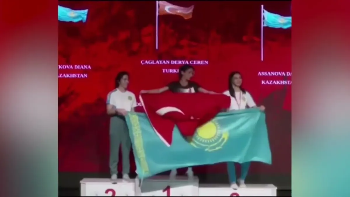 Победительница соревнований — турчанка Деря Джерен и казахстанки Дана Асанова и Диана Тюкова, завоевавшие, соответственно, бронзовую и серебряную медали мирового первенства, соперничали на пьедестале, пытаясь развернуть на передний план флаг именно своей страны.