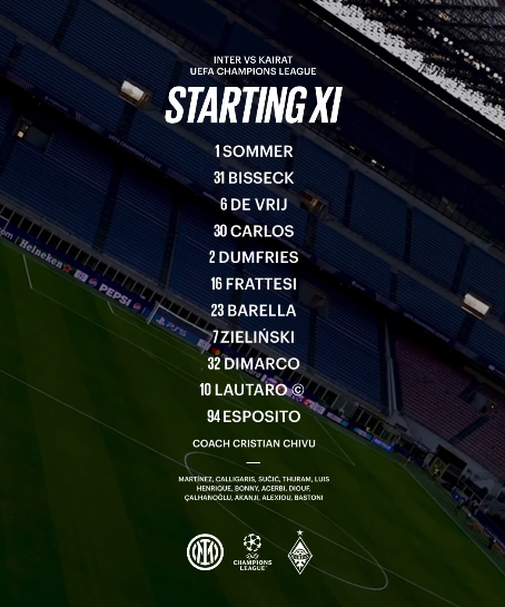 «Интер»: Зоммер, Биссек, Де Врей, Дюмфрис, Фраттези, Барелла, Зелиньски, Димарко, Эспозито, Мартинес, Аугусто.