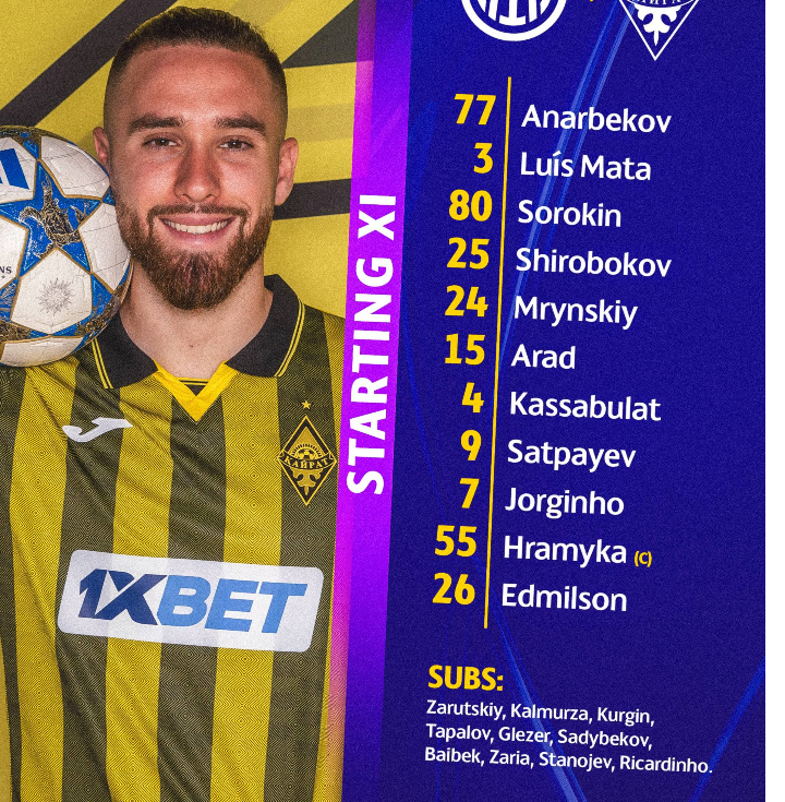 Стали известны стартовые составы «Кайрата» и итальянского «Интера» на матч четвертого тура общего этапа Лиги Чемпионов, передает ИА «NewTimes.kz».