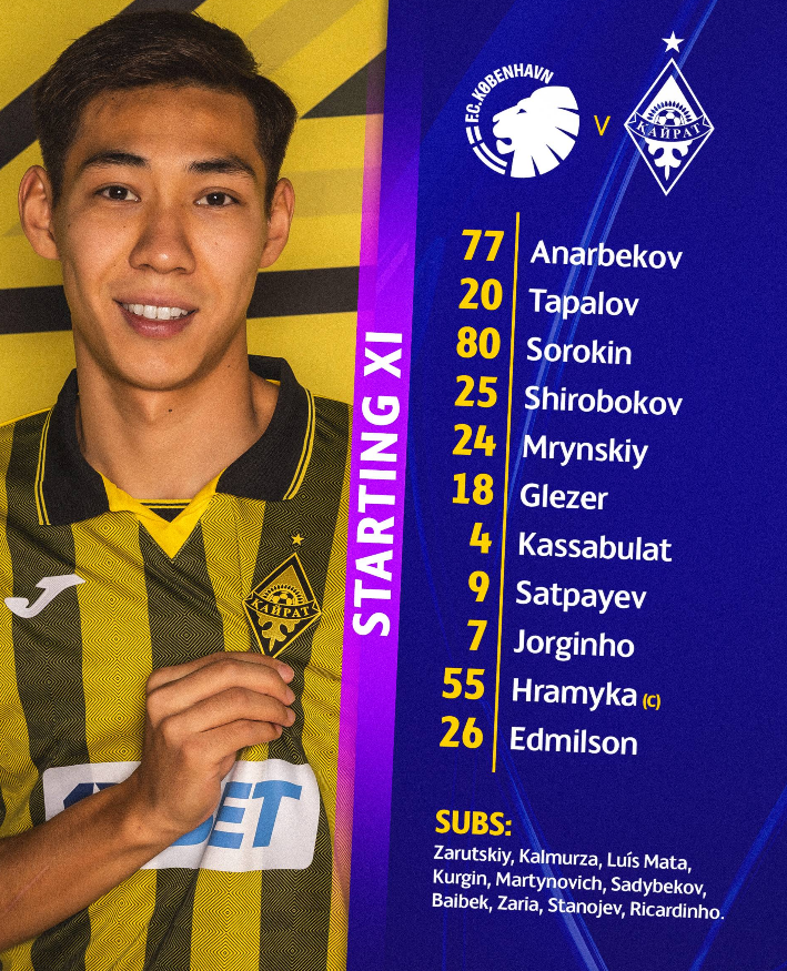 Стали известны стартовые составы «Копенгагена» и «Кайрата» на матч пятого тура общего этапа Лиги Чемпионов.