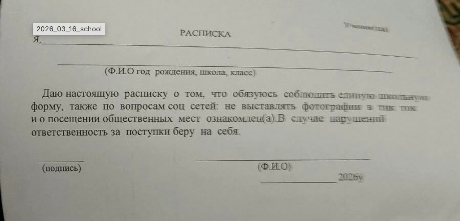 Документы начали распространять 16 марта. Согласно требованиям, школьники обязуются «не выставлять фотографии в TikTok о посещении общественных мест».