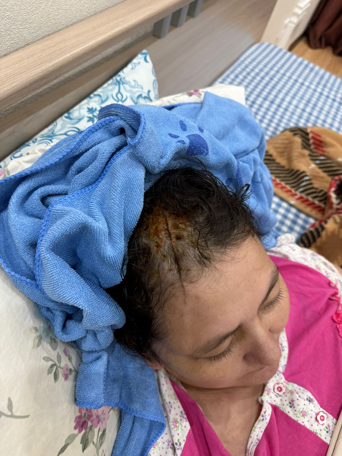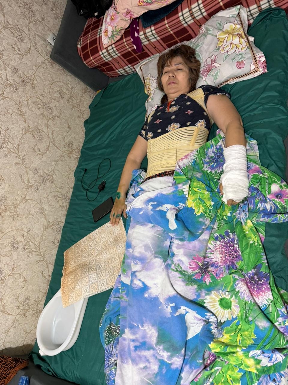 «У меня сотрясение мозга, черепно-мозговая травма, голову зашили. Палец сломан в двух местах, перелом ключицы, три ребра сломаны, позвоночник — перелом в двух местах. Одна я не встаю — голова кружится, боюсь упасть. Сама почти ничего не могу: повернуться, лечь — всё через боль. Корсет нельзя снимать два месяца, но на ночь снимаю, иначе не выдерживаю», — рассказывает женщина.