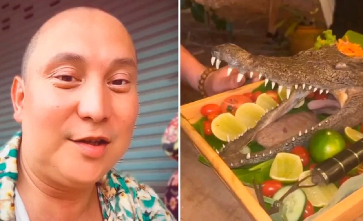 Екеуі бір топ шетелдіктермен бір дастархан басында отырған. Дастарханға қолтырауынның басы да қойылған.