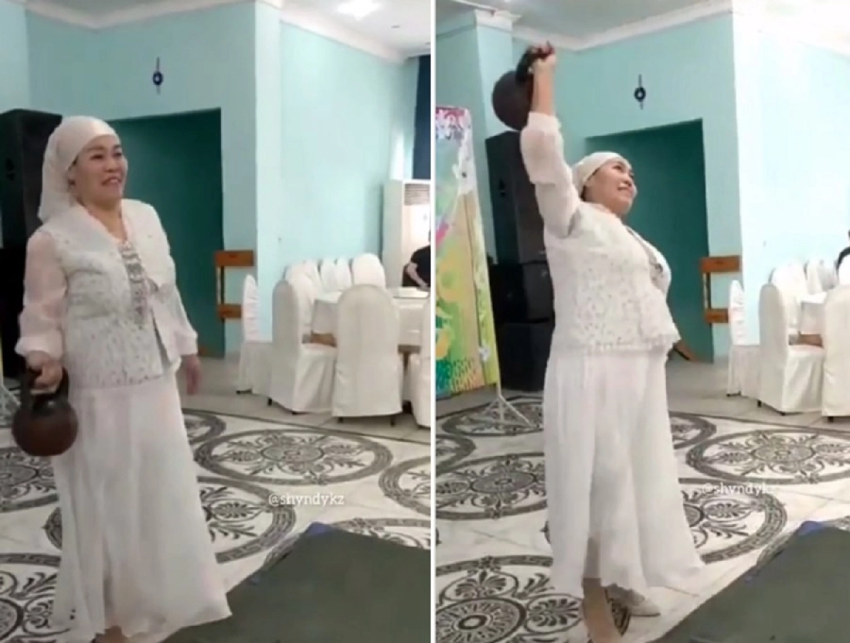 Бейнежазбадағы күлімсіреген әйел оң қолымен гір тасын көтеріп жатқанда, тамада 80 рет санады. Бүкіл зал оған қошемет көрсетті.
