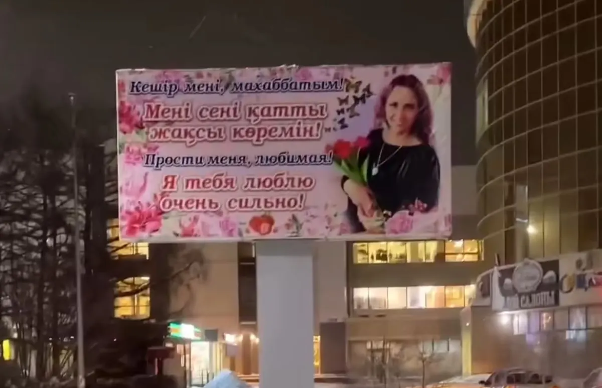 Карагандинец разместил огромный баннер с извинениями женщине в центре города