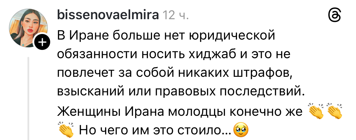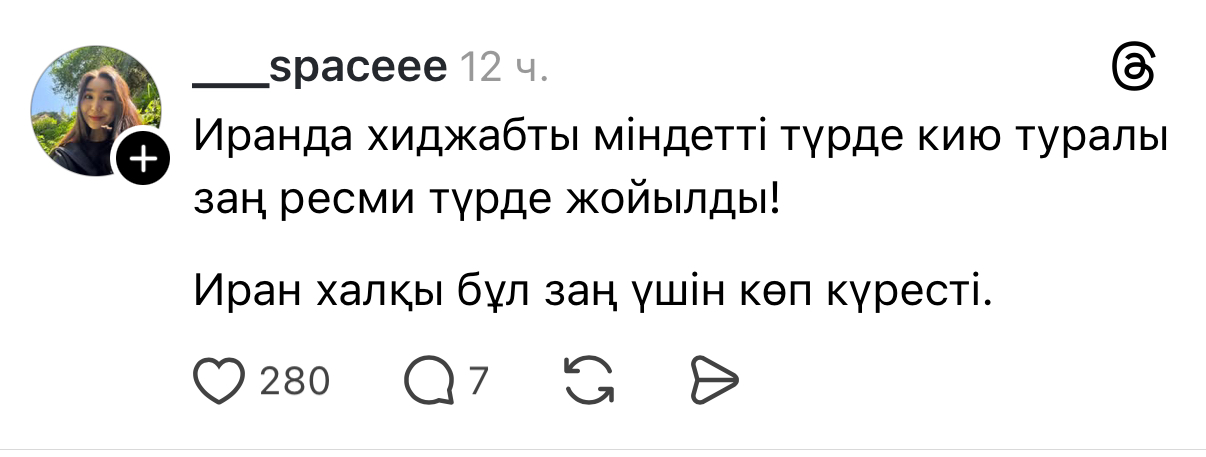 Эта новость вызвала широкий отклик в социальных сетях. Пользователи, в том числе из Казахстана, выразили поддержку и радость за иранских женщин, многие из которых в течение последних лет боролись против закона об обязательном ношении хиджаба.