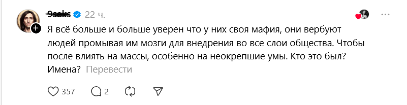 «Я все больше и больше уверен что у них своя мафия, они вербуют людей промывая им мозги для внедрения во все слои общества. Чтобы после влиять на массы, особенно на неокрепшие умы».