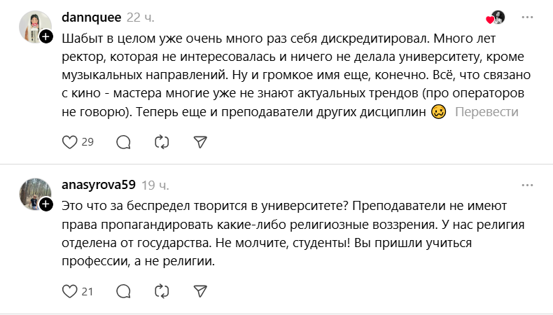 «”Шабыт” в целом уже очень много раз себя дискредитировал. Много лет ректор, которая не интересовалась и ничего не делала университету, кроме музыкальных направлений. Ну и громкое имя еще, конечно. Все, что связано с кино – мастера многие уже не знают актуальных трендов (про операторов не говорю). Теперь еще и преподаватели других дисциплин».