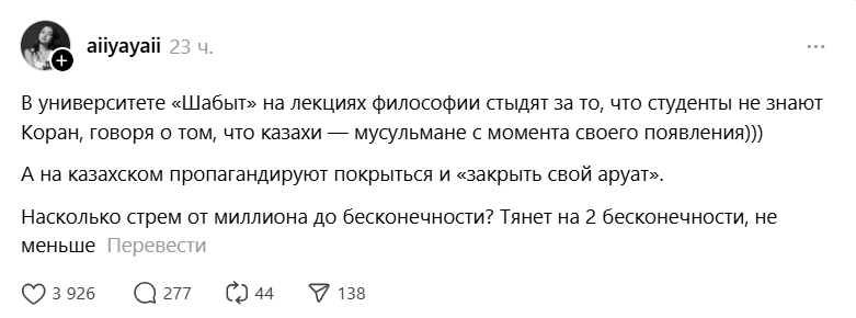 «В университете “Шабыт” на лекциях философии стыдят за то, что студенты не знают Коран, говоря о том, что казахи — мусульмане с момента своего появления. А на казахском пропагандируют покрыться и “закрыть свой аруат”. Насколько стрем от миллиона до бесконечности? Тянет на 2 бесконечности, не меньше», – пишет девушка в Threads.