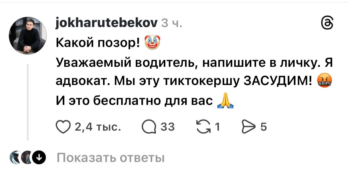 «Какой позор! Уважаемый водитель, напишите в личку. Я адвокат. Мы эту тиктокершу засудим! И это бесплатно для вас», — отметил адвокат.