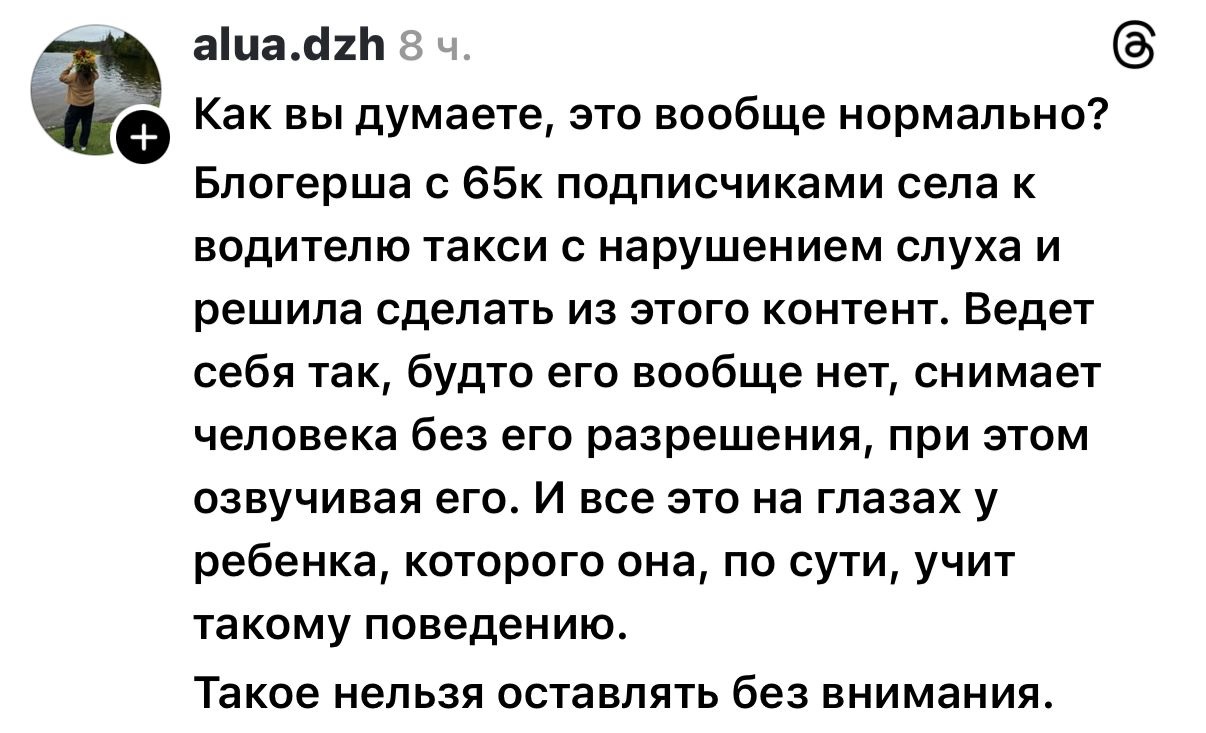 Казахстанская блогерша оказалась в центре общественного возмущения после публикации видео, где она снимала и озвучивала поведение слабослышащего таксиста, игнорируя его присутствие, при этом рядом находился ребенок. Видео быстро удалили после волны критики, передает ИА «NewTimes.kz»
