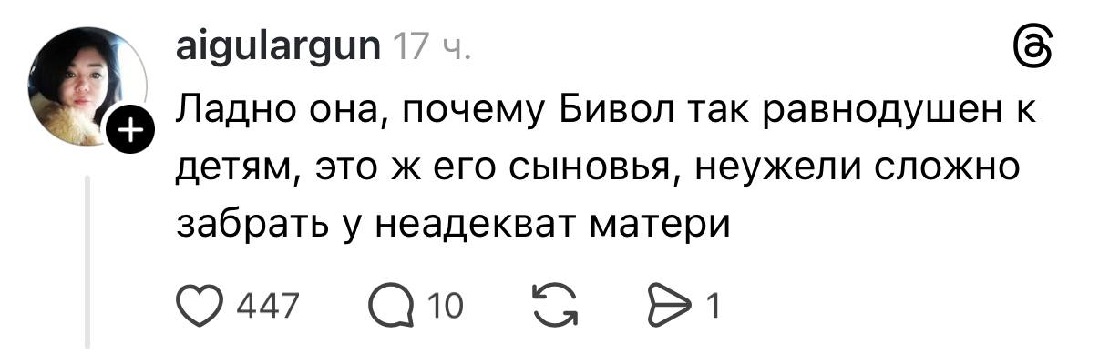 После появления в Сети видео, где она использует оскорбительные выражения в адрес казахов и кыргызов, пользователи разделились: одни требуют наказать женщину по всей строгости закона, другие — призывают не судить строго, считая, что Бивол нуждается в психологической помощи.