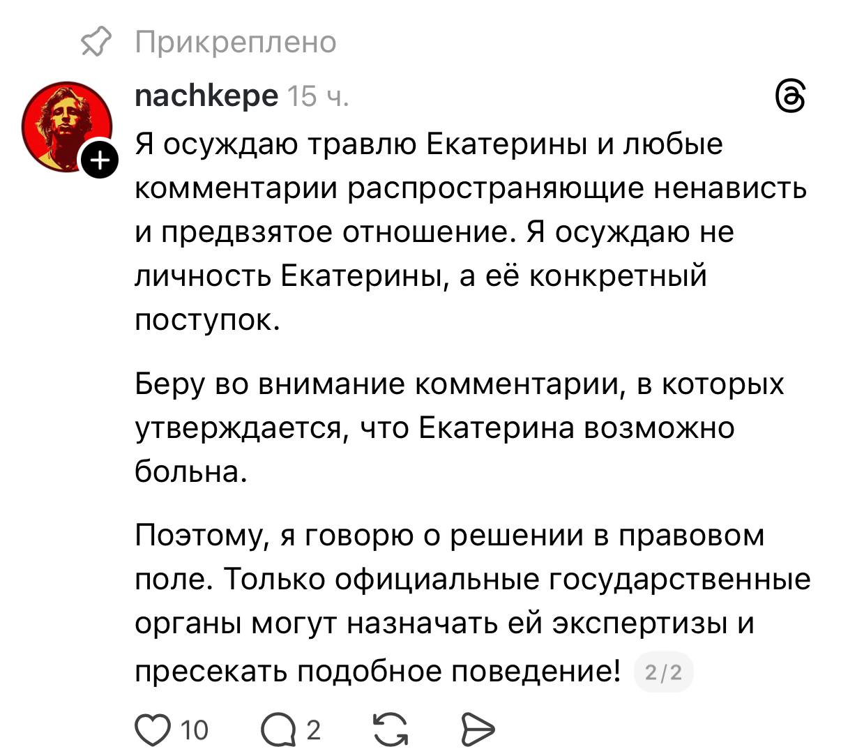 Тем временем МВД Кыргызстана начало проверку по факту высказываний Екатерины Бивол. Ведомство рассматривает возможность возбуждения уголовного дела по статьям о разжигании национальной и религиозной розни. Ранее 35-летняя уроженка Санкт-Петербурга опубликовала видео, где использовала нецензурную лексику в адрес жителей Казахстана и Кыргызстана. После критики ее аккаунт был заблокирован, но ролик продолжает распространяться в Сети. Боксер Дмитрий Бивол, уроженец Кыргызстана, с 11 лет живет в России. В 2023 году стало известно о его расставании с Екатериной после 16 лет брака. У пары двое сыновей — Мирон и Никон.