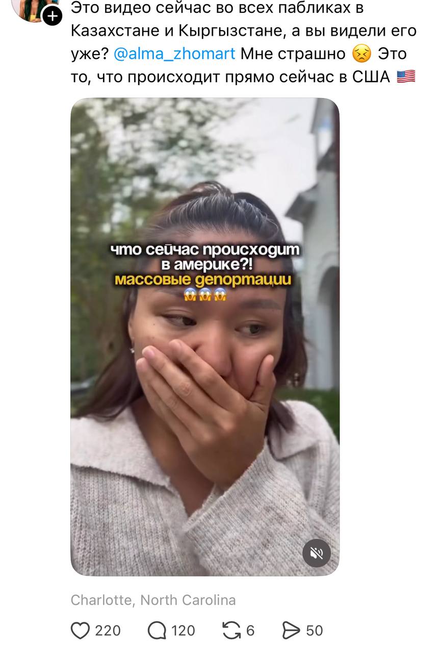 Жительница США казахстанка Алма Бекетаева, которая живет с семьей в Шарлотт, рассказала о массовых депортациях, которые сейчас происходят в Америке. Она подчеркнула, что эта проблема затрагивает не только нелегальных мигрантов, но и людей из стран СНГ, проживающих легально, передает ИА «NewTimes.kz».