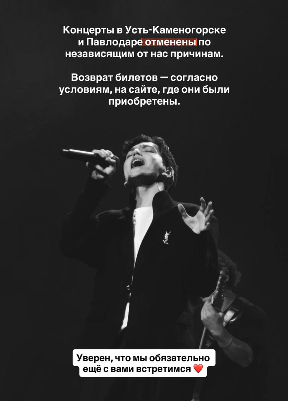 Как стало известно, концерты, запланированные в Павлодаре и Усть-Каменогорске, не состоятся. По данным администрации Дворца культуры имени Естая, где артист должен был выступить 28 октября, здание временно закрыто из-за коммунальных неполадок.