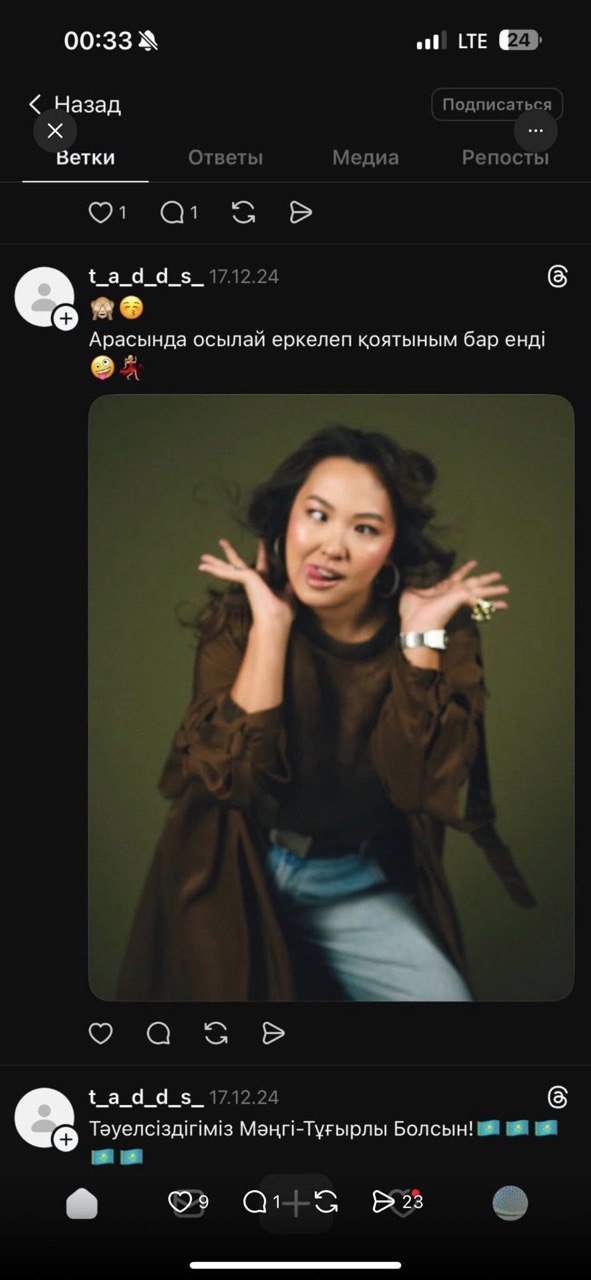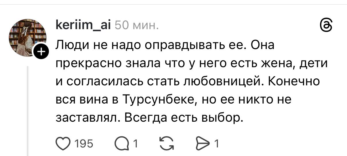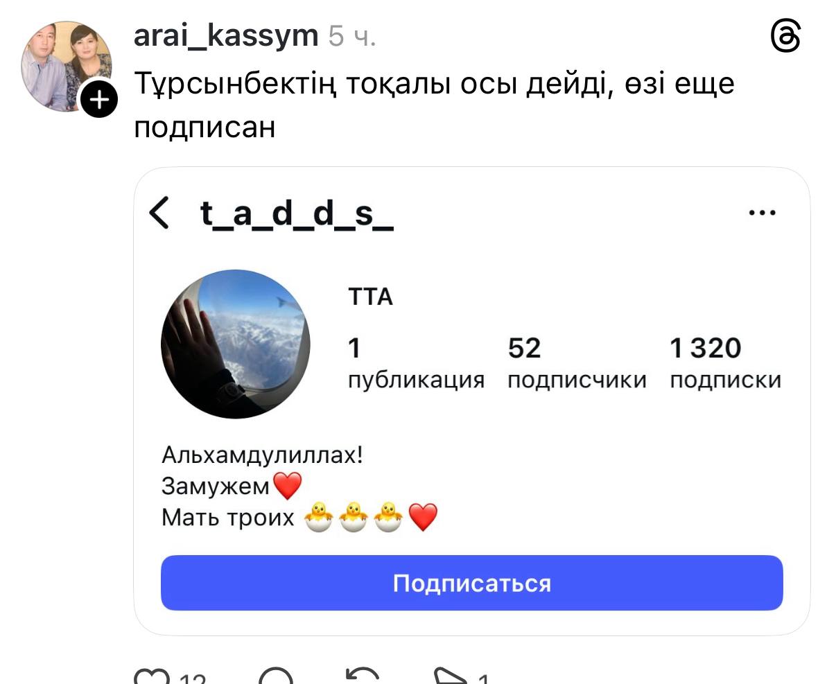 Также в соцсети Threads распространились фото женщины, которую пользователи называют второй женой известного казахстанского юмориста Турсынбека Кабатова. Посты с ее снимками быстро набрают популярность, вызвав бурные споры в сети. По данным пользователей, у женщины закрытый аккаунт, на который подписано 51 человек. В биографии профиля указано: «Замужем, мама троих детей». Как утверждают в обсуждениях, она родила Кабатову троих детей — сына и двух дочерей. Пользователи отметили, что на ее закрытый аккаунт якобы подписан сам Турсынбек Кабатов.