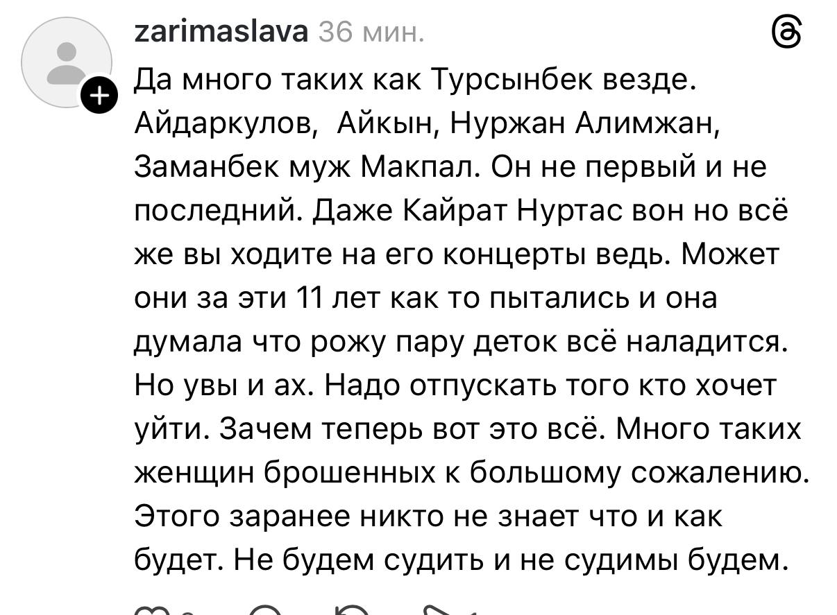 «Он талантливый, но прежде всего человек. Имеет право на счастье и на ошибки. Молдир — взрослая женщина, пусть живёт дальше. А Турсынбек недавно перенёс операцию! Пусть всё у них наладится», – написали в комментариях.