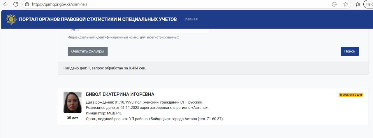 Ориентировка на 35-летнюю женщину появилась 1 ноября на портале правовой статистики Комитета по правовой статистике и специальным учетам Генпрокуратуры.
