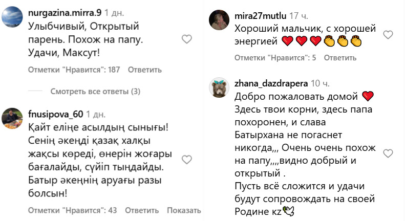 «Добро пожаловать домой. Здесь твои корни, здесь папа похоронен, и слава Батырхана не погаснет никогда. Очень очень похож на папу»;