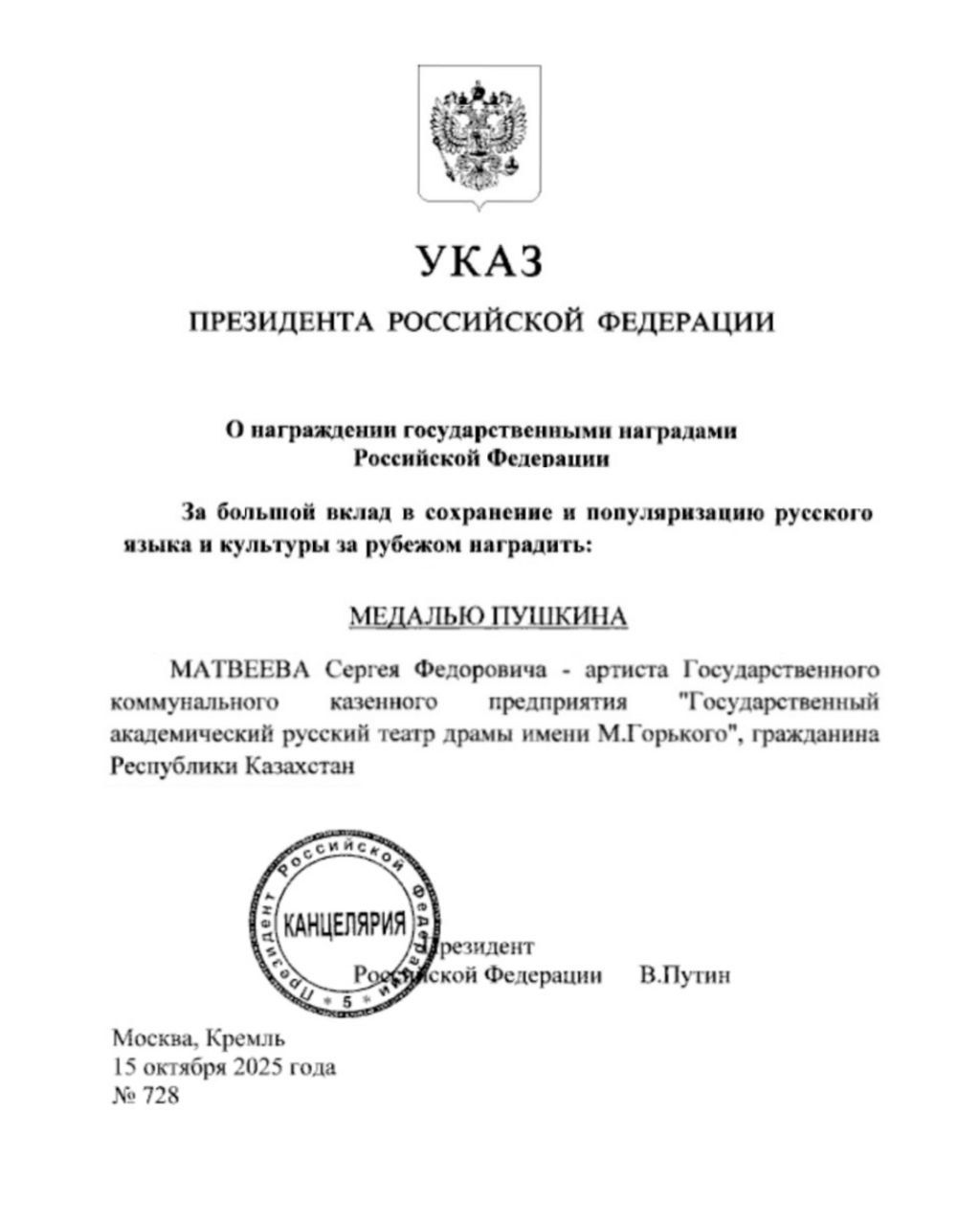 Президент России Владимир Путин в ходе торжественной церемонии в Кремле, посвященной Дню народного единства, вручил медаль Пушкина актеру Государственного академического русского драматического театра имени М. Горького из Астаны Сергею Матвееву, передает ИА «NewTimes.kz» со ссылкой на Посольство России в Казахстане