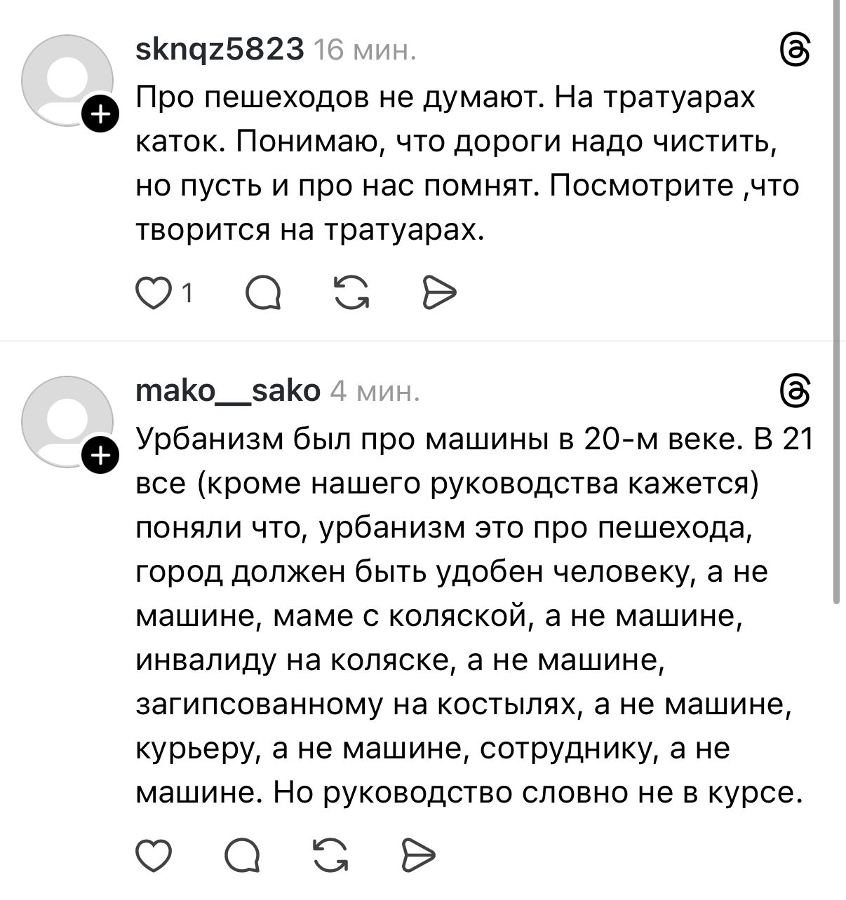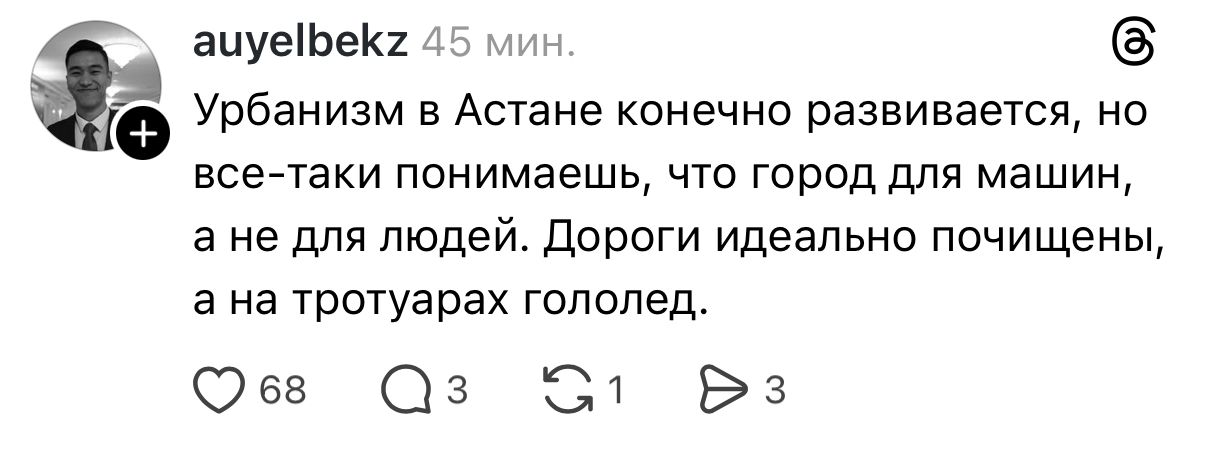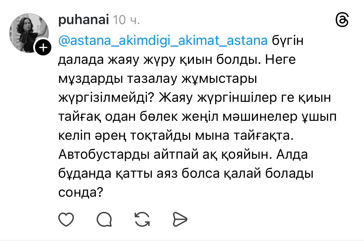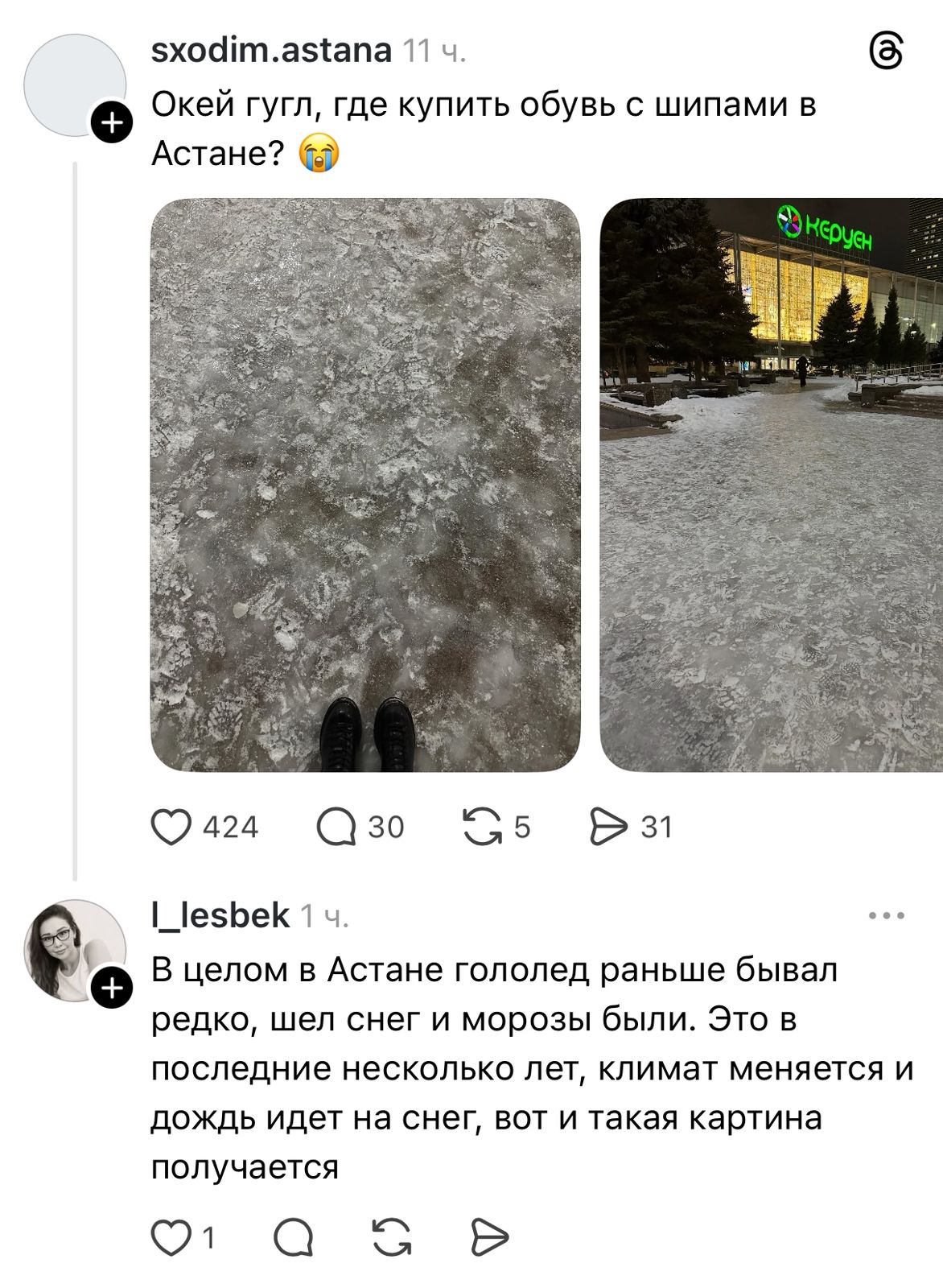 В сложившейся ситуации астанчане критикуют акимат за несвоевременную уборку улиц, отмечая, что город по-прежнему плохо приспособлен для пешеходов. Одни пользователи отмечают ведомство в соцсетях, призывая обратить внимание на проблему, другие — всерьёз ищут обувь с шипами, чтобы хоть как-то безопасно передвигаться по обледеневшим тротуарам.