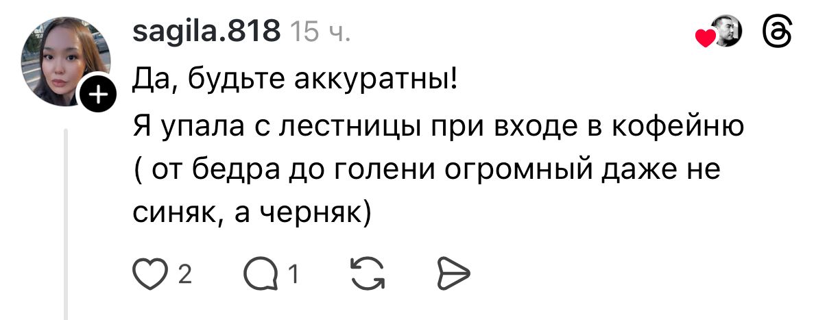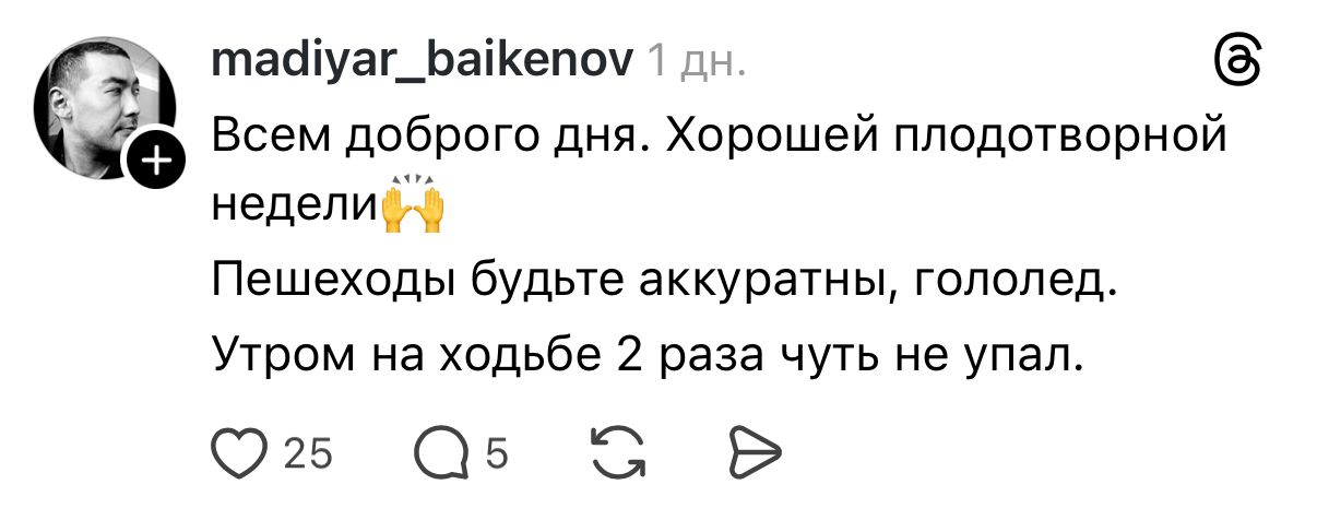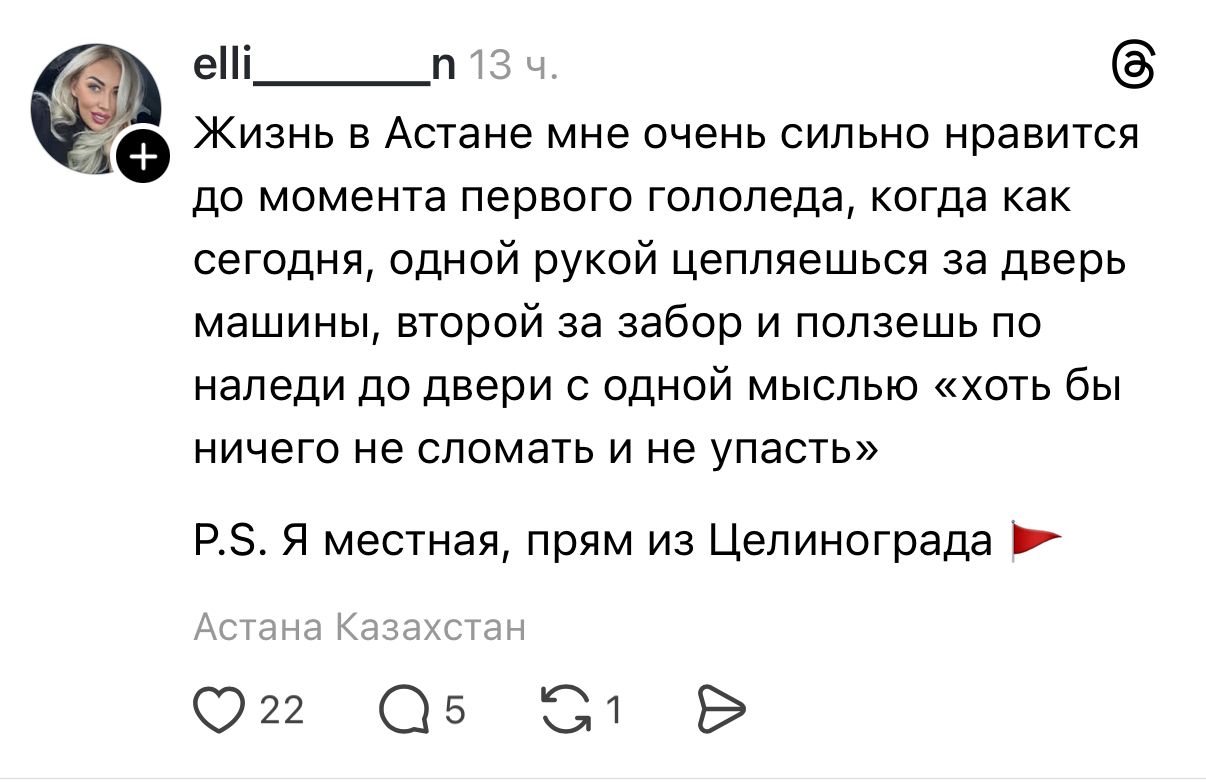 Астанчане в Threads предупреждают друг друга об опасности на дорогах. По словам жителей столицы, по тротуарам буквально невозможно пройти, некоторые уже успели поскользнуться на гололеде и получить травмы.