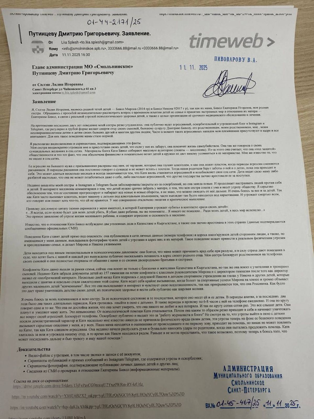 Что интересно, в этот же момент в сети появилось и фото документа, который якобы стал основанием для ее приглашения в психиатрическое учреждение. В нем автор жалобы утверждает, что Екатерина «регулярно в грубой форме желает смерти бывшему супругу, его родственникам, мне и моим детям» и делает подобные заявления в присутствии детей. В тексте также говорится, что женщина якобы угрожала себе и несовершеннолетним.