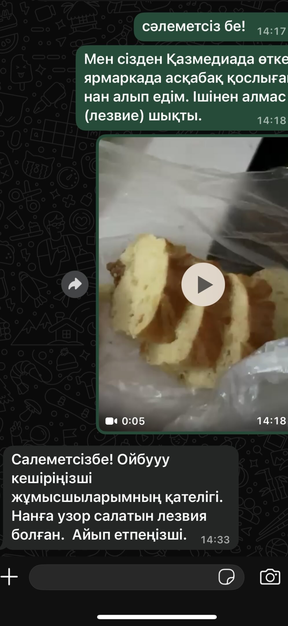 Астанчанка заявила, что нашла лезвие внутри тыквенного бездрожжевого хлеба, который она приобрела на республиканской выставке «Бір ауыл – бір өнім». Мероприятие проходило в здании «Казмедиа» и было организовано при участии Министерства национальной экономики и НПП «Атамекен», передает ИА «NewTimes.kz».